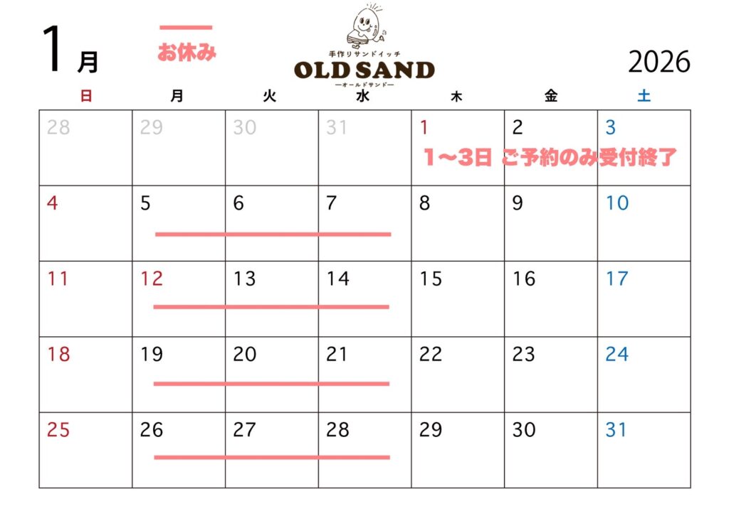 いつもオールドサンドをご利用いただき、ありがとうございます。 1月の営業日についてお知らせいたします。