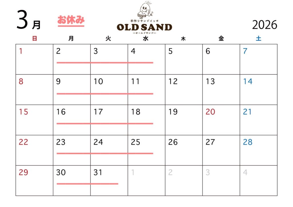 いつもオールドサンドをご利用いただき、ありがとうございます。3月の営業日についてお知らせいたします。